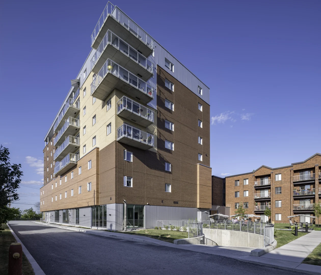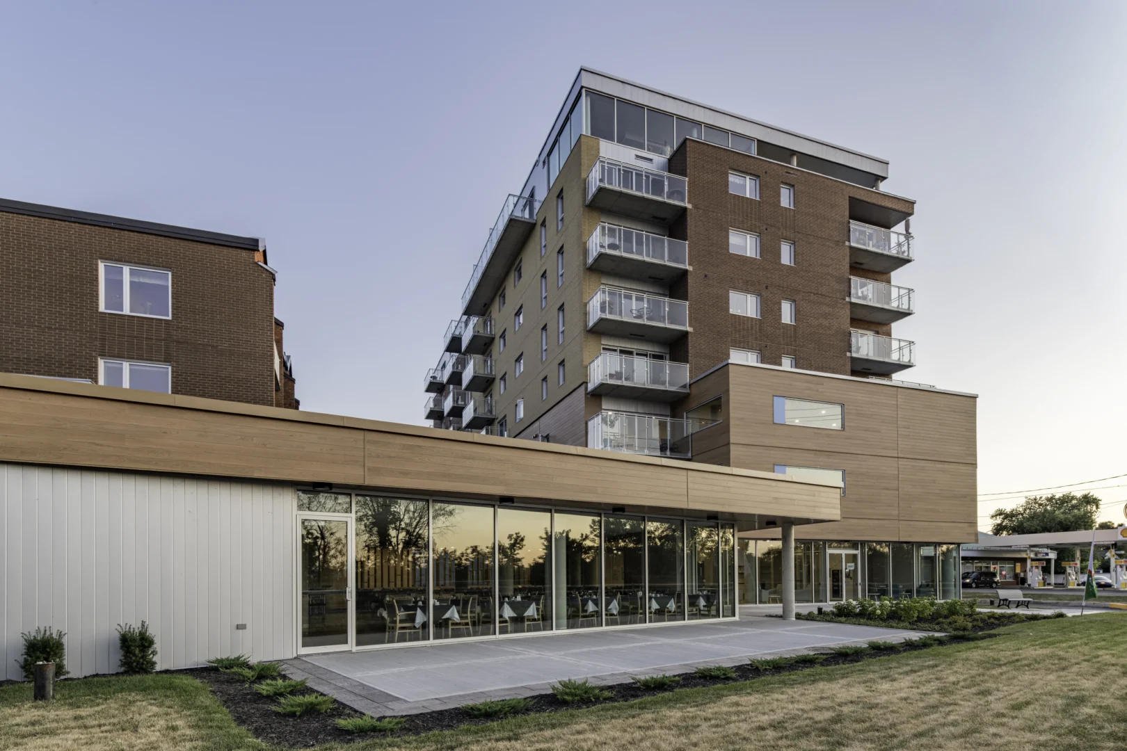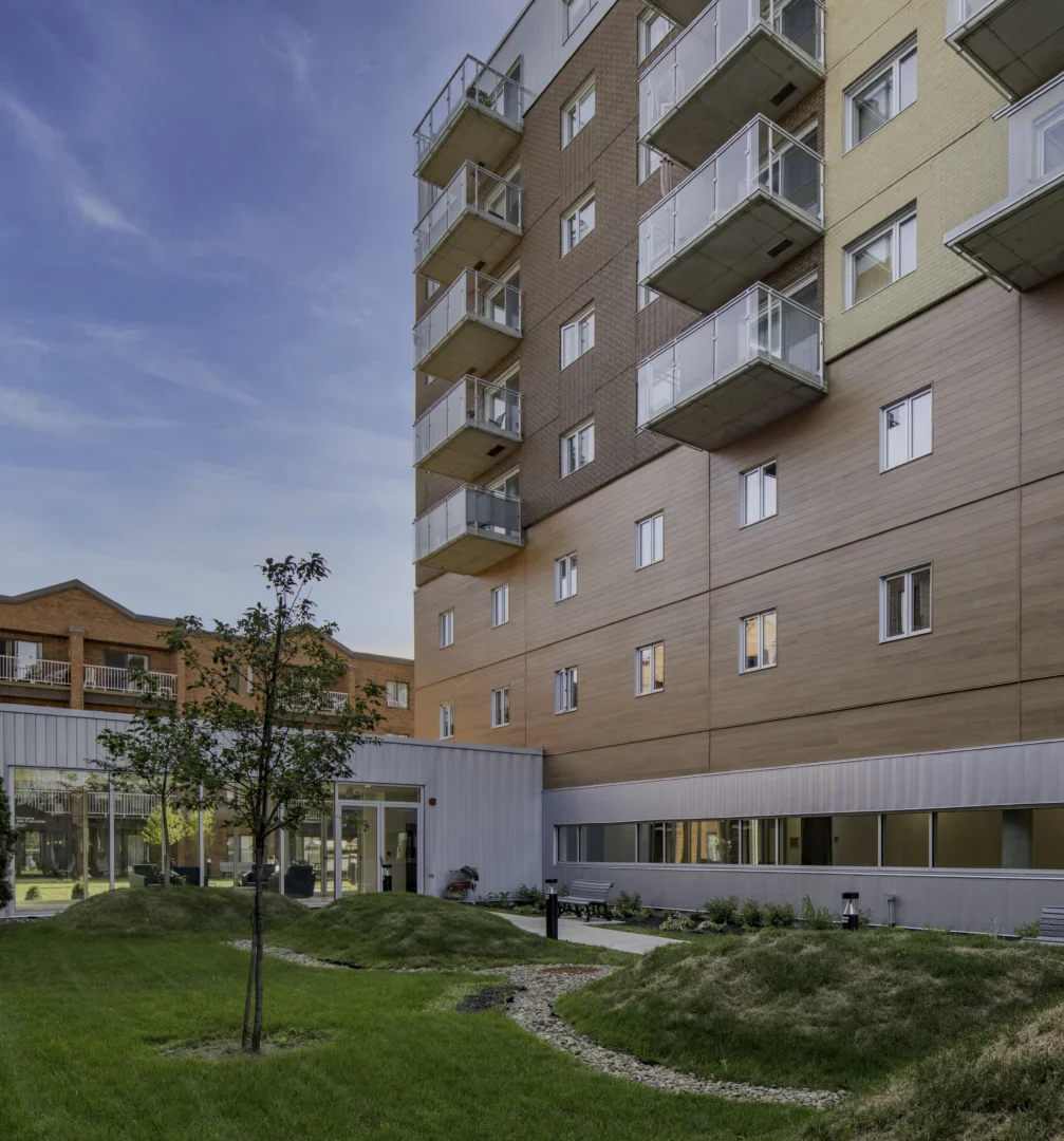 Le Domaine des Cascades est une résidence évolutive destinée aux personnes autonomes et semi-autonomes, située en bordure du fleuve Saint-Laurent. Ce projet d’agrandissement, réparti sur huit étages, comprend un basilaire où se trouvent la salle à manger, la cuisine ainsi que des espaces dédiés aux activités.